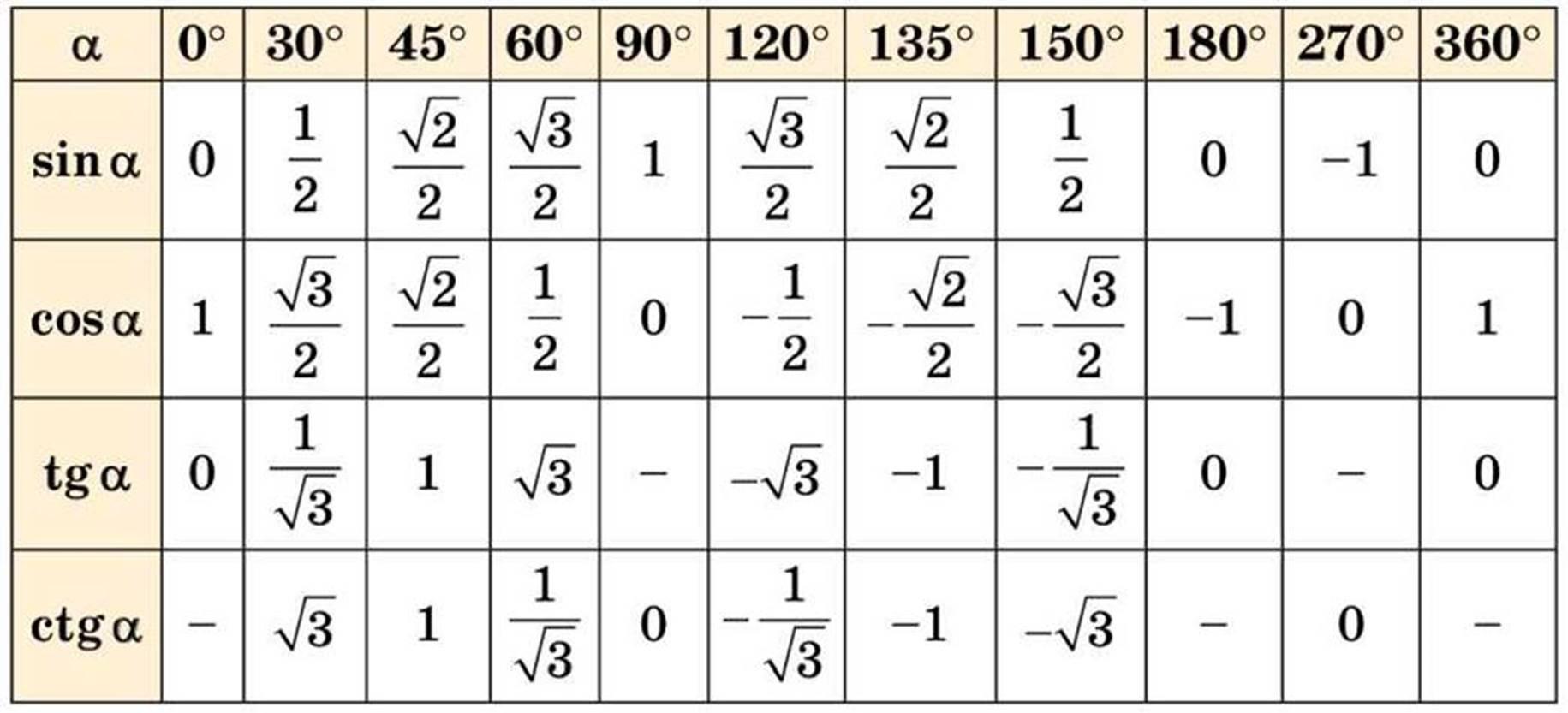 Есть таблица синусов, косинусов, тангенсов и котангенсов. Ее можно найти в интернете.
