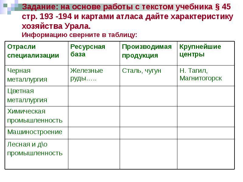 Машиностроение. Ресурсная база: металл. Производимая продукция: автомобили, электрички, поезда. Крупнейшие центры: Москва, Екатеринбург, Пермь, Челябинск