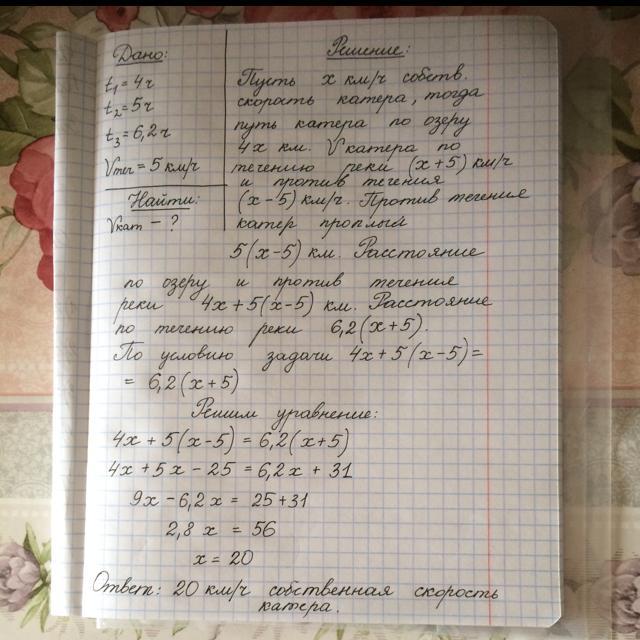 - Катер за 4 часа по оверу и за 5 часа против течения реки проплывает такое же расстояние, что за 6.2 ч по течению реки. Найдите собственную скорость катера, если скорость течения реки равна 5 км/ч