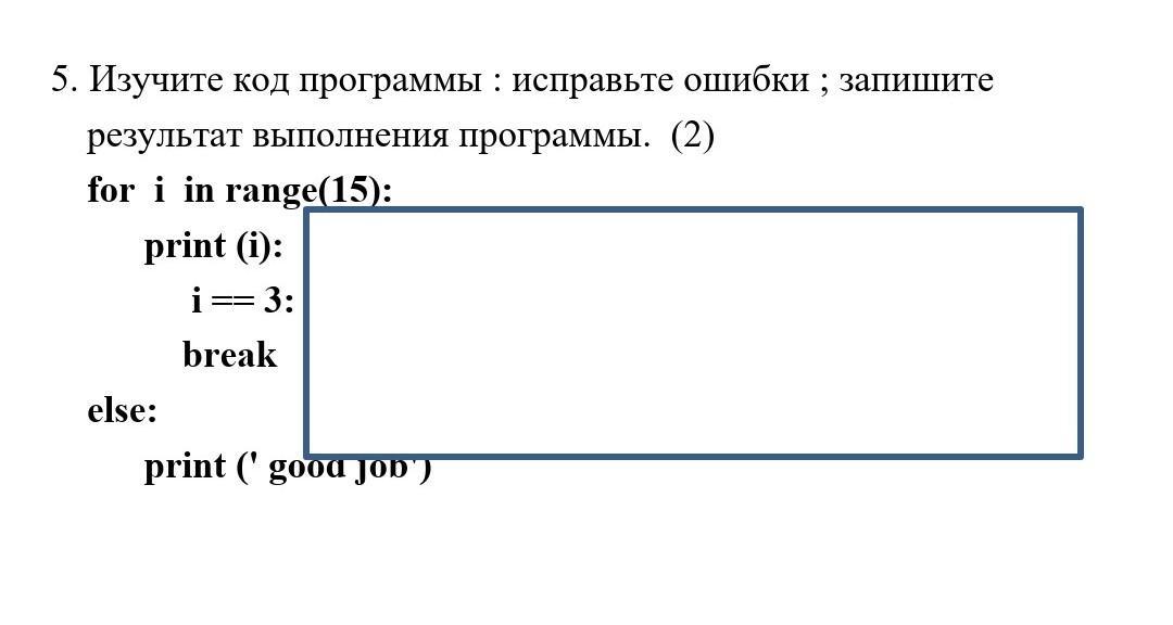 1. Изучите код программы : исправьте ошибки ; запишите результат выполнения программы. for i in range(15): print (i): i == 3: break else: print (' good job')