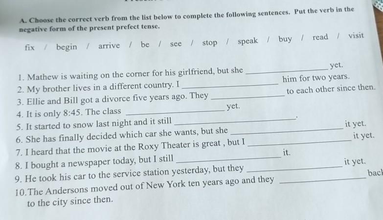 A. Choose the correct verb from the list below to complete the following sentences. Put the verb in the
