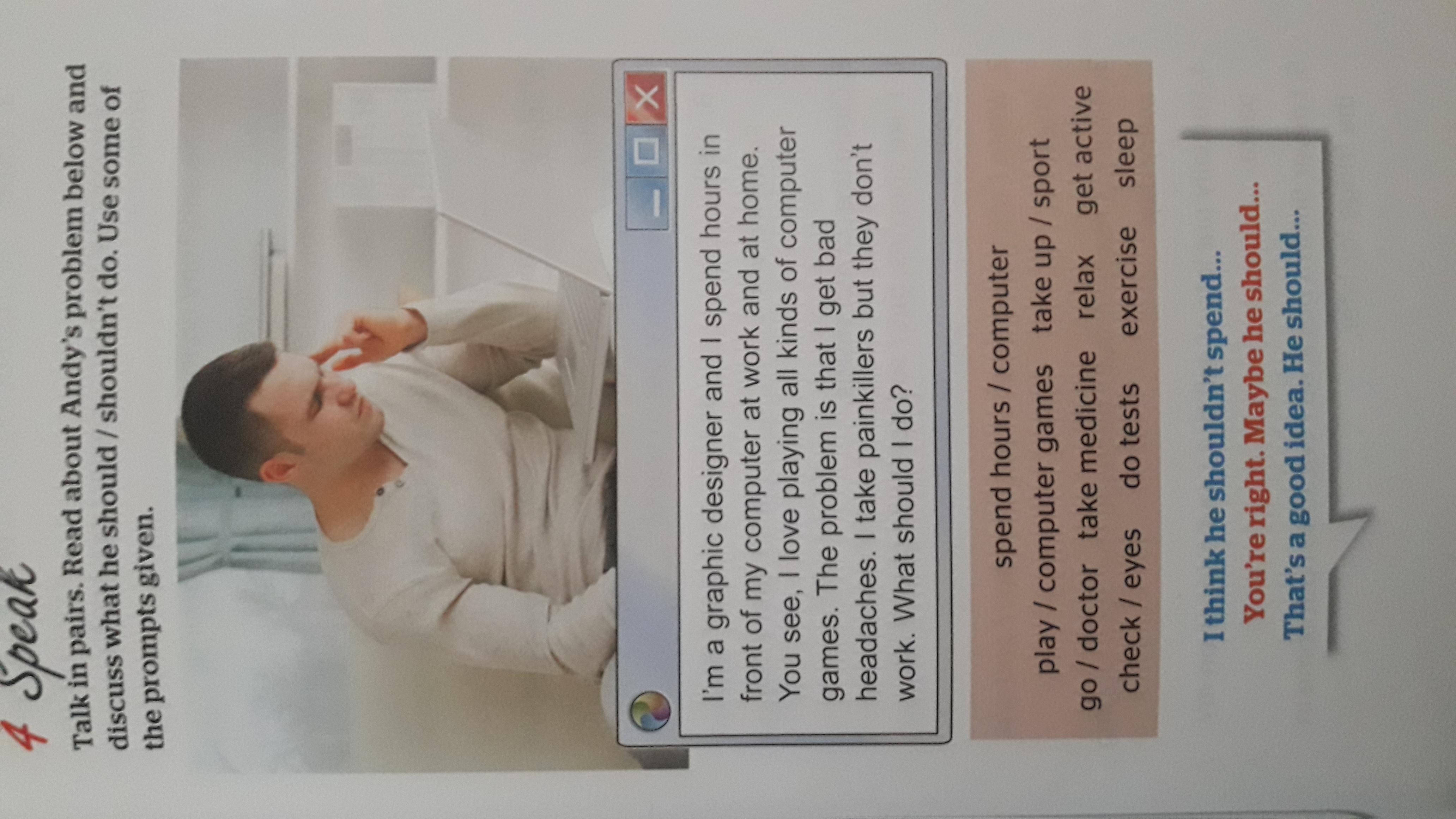 Ответ: Тебе нужно написать, что следует делать Анди с его проблемой. Его проблема в том, что у него болит голова часто от того, что сидит постоянно за компьютером на работе и дома. Он работает дизайнером, а дома любит играть в игры. Тебе нужно ему посоветовать что-нибудь и составить диалог с твоим другом как вы обсуждаете, что ему делать.