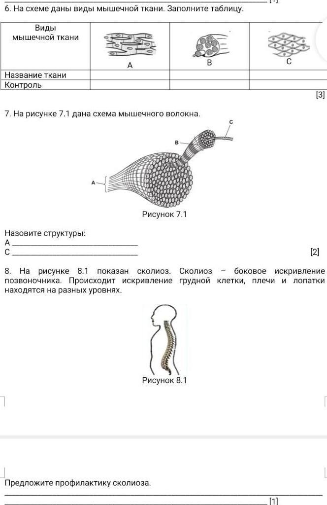 Рисунок 5.1 6. На схеме даны виды мышечной ткани. Заполните таблицу. [1] Виды мышечной ткани Название ткани A B [3] Контроль 7. На рисунке 7.1 дана схема мышечного волокна. Рисунок 7.1 Назовите структуры: A C [2] 8. На рисунке 8.1 показан СКОЛИОЗ. Сколиоз боковое искривление позвоночника. Происходит искривление грудной клетки, плечи и лопатки находятся на разных уровнях. Рисунок 8.1 Предложите профилактику сколиоза. [1]