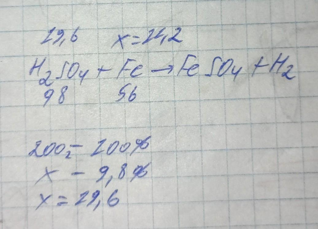 Найти массу железа, вступившего в реакцию замещения с 200 граммами 9,8%-ного раствора серной кислоты?