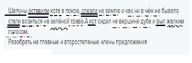 Шалуны оставили кота в покое, слезли на землю и как ни в чём не бывало стали возиться на зелёной траве.А кот сидел на вершине дуба и выл жалким голосом.