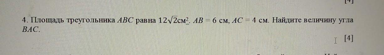 площадь треугольника АВС равна 12√2см².АВ=6см,АС=4см.Найдите величину угла ВАС