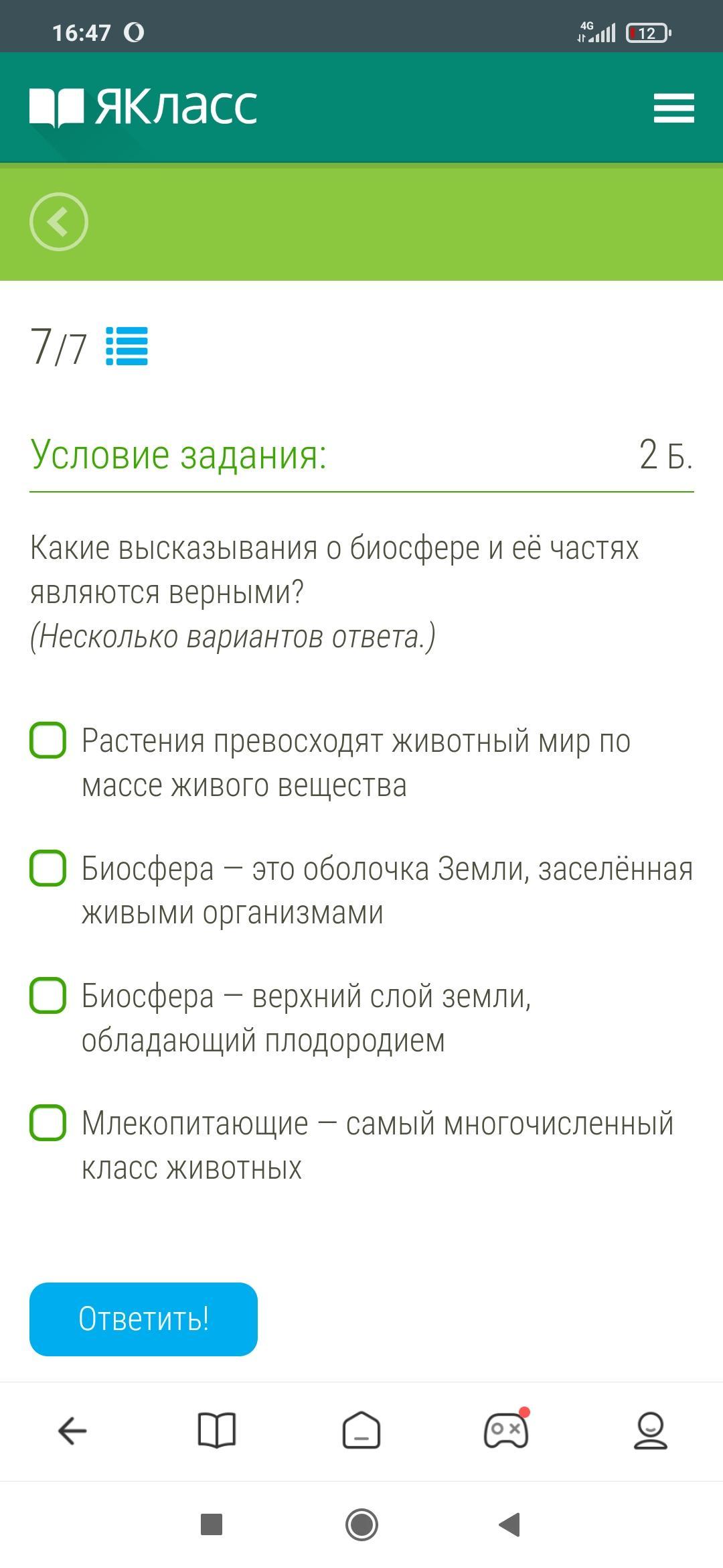 Верные высказывания: Биосфера - это оболочка Земли, заселенная живыми организмами, Растения превосходят животный мир по массе живого вещества.