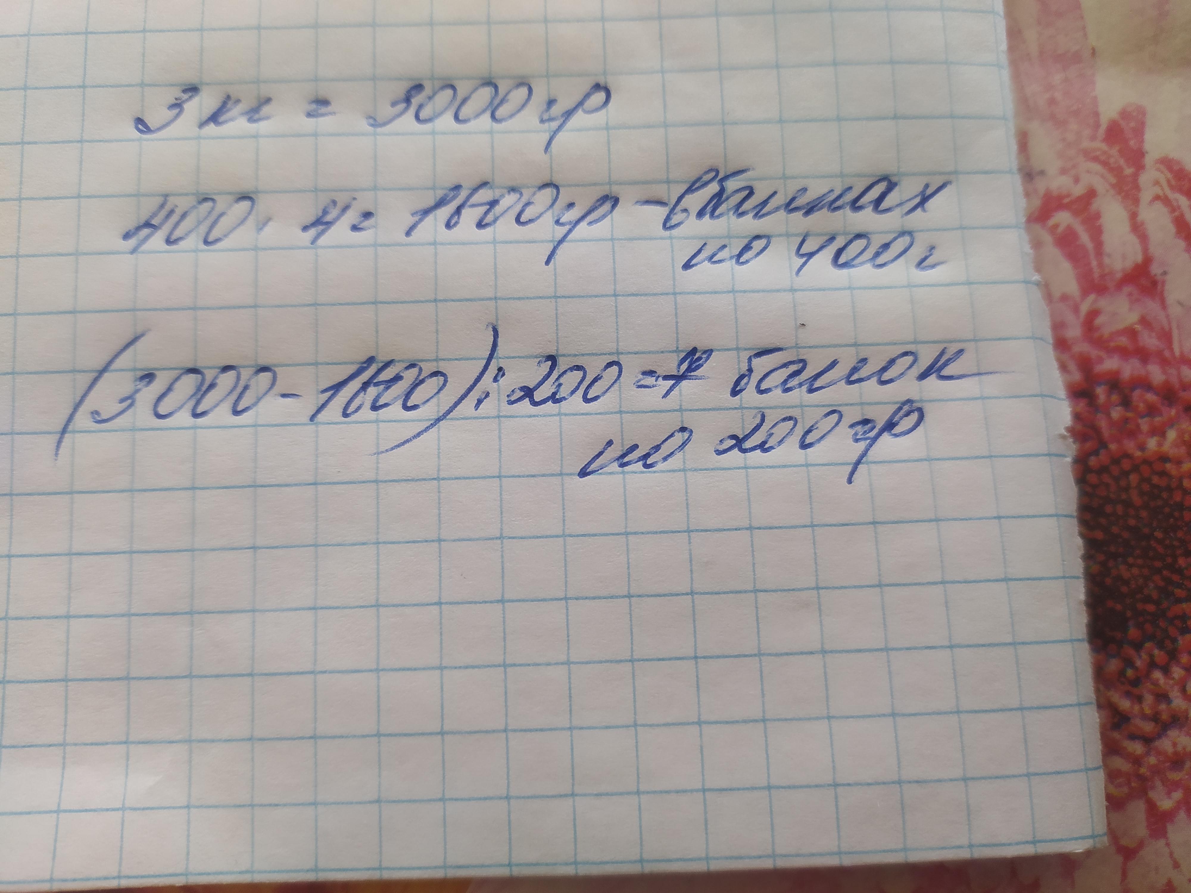 Три килограмма варенья разложили в банки по 400г и в банки по 200г. Банок по 400г оказалось 4. Сколько потребовалось банок по 200г?
