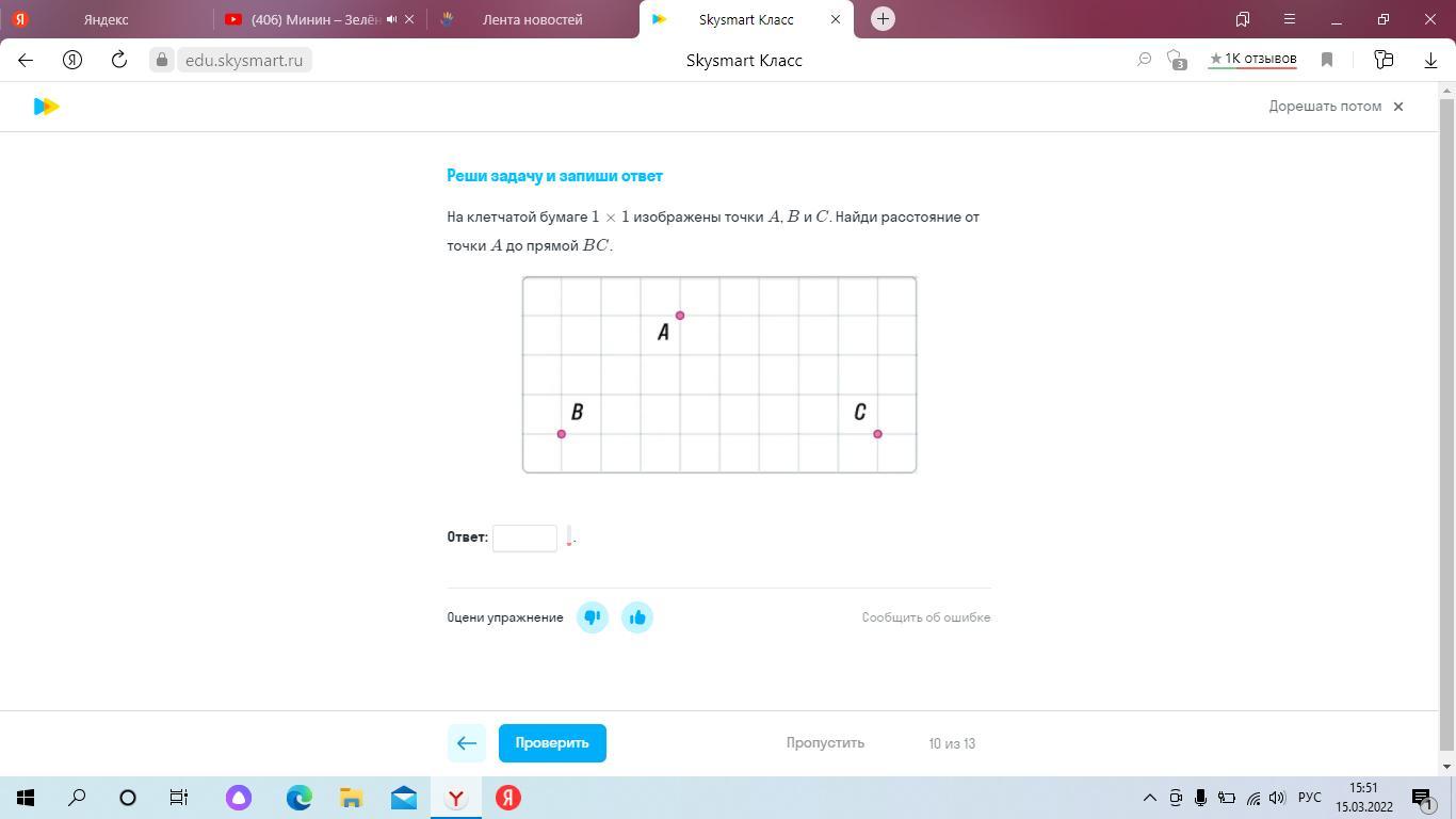 ПОМОГИТЕ ПОЖАЛУЙСТА на клетчатой бумаге 1 х 1 изображены точки а б с найти расстояние от а до бс