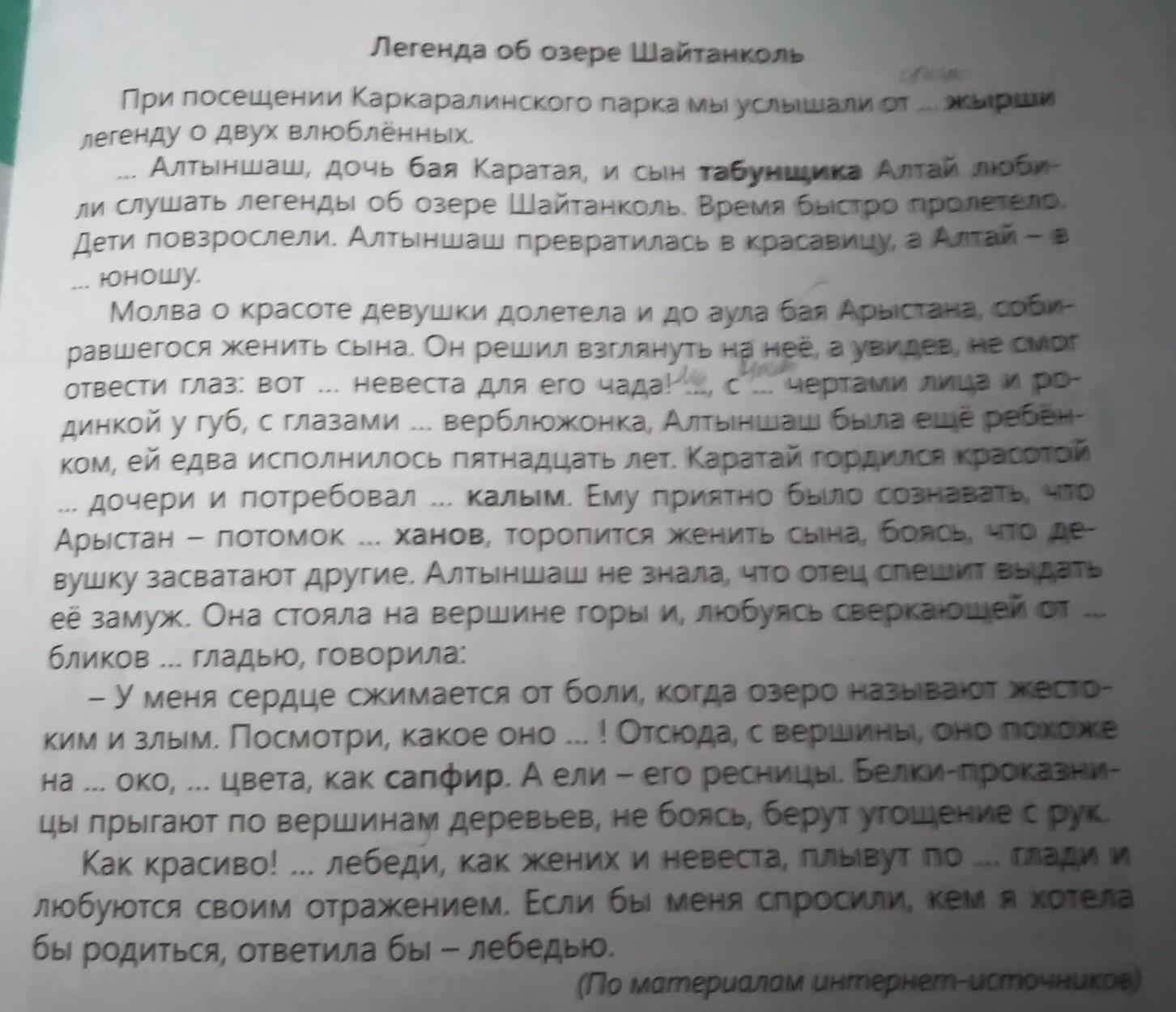 Читаем и пишем Прочитайте фрагмент легенды об озере Шайтанколь и вставьте по смы лагательные на место пропусков. Какова роль прилагательных в данном Определите род, падеж, число прилагательных.