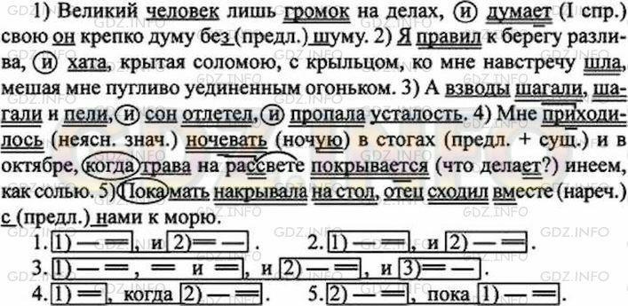 1. Великий человек лишь громок на делах и дума..т свою он крепко думу (без)шуму. (И. Крылов) 2. Я правил к берегу разлива и хата крытая соломою, с крыльцом, ко мне навстречу шла, мигая мне пугливо уединённым огоньком. (Я. Полонский) 3. Мне преходилось ноч..вать (в)стогах и в октябре когда трава на ра(с, сс)вете покрывает(?)ся инеем, как солью. (К. Паустовский) 4. А взводы шагали, шагали и пели и сон отлетел и пропала усталость. (А. Сурков) 5. Пока мать накрывала на стол отец сходил (в)месте (с)нами к морю. (А. Первенцев)