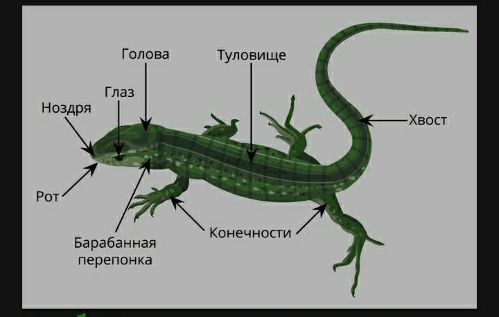 Тело пресмыкающихся разделяется на голову, туловище, хвост, передние и задние конечности (отсутствуют у змей). Конечности располагаются по бокам туловища и прижимаются к земле (как бы смыкаются с поверхностью), поэтому этот класс получил такое название — пресмыкающиеся. Кожа сухая, не содержит желез.