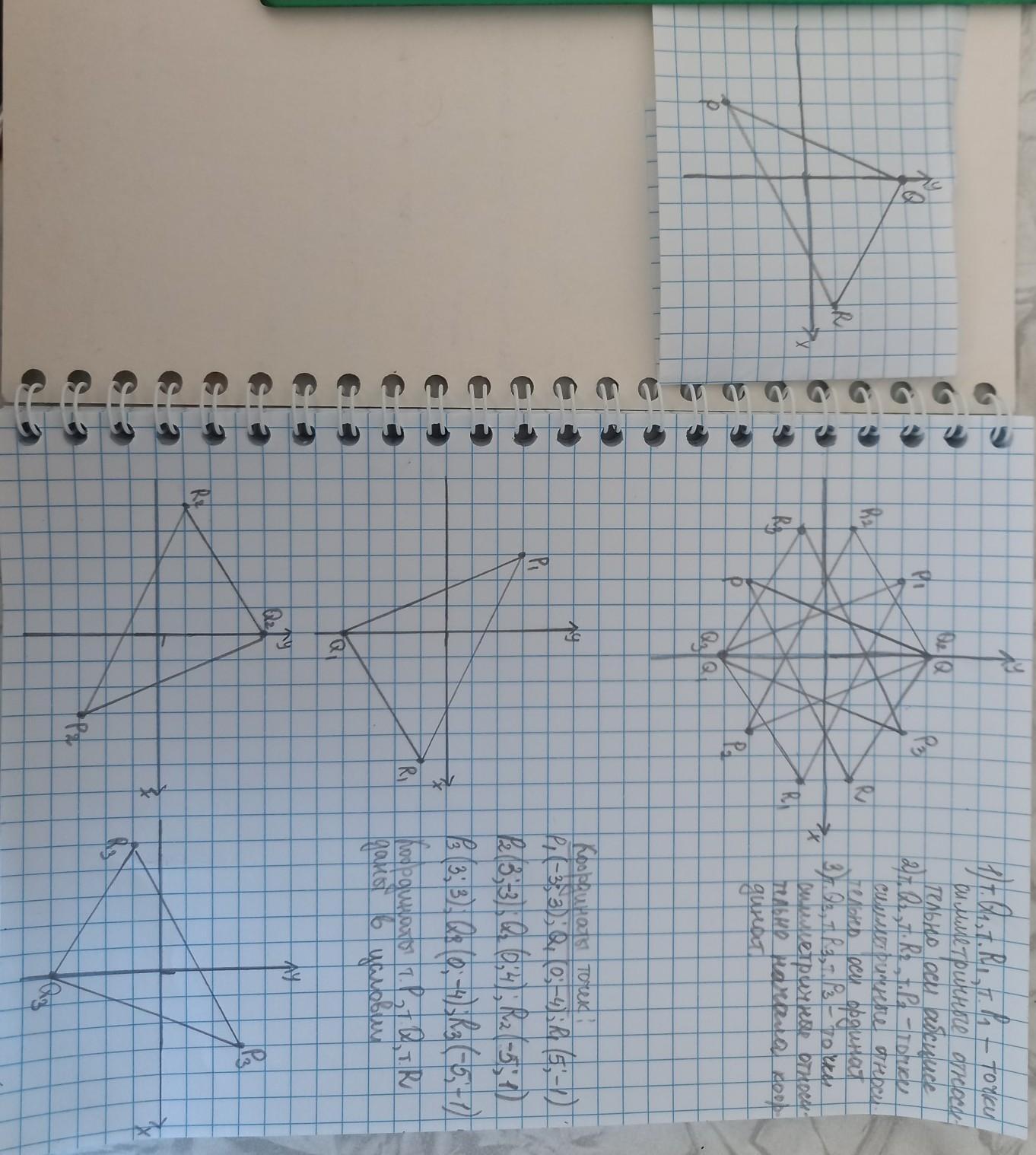 Даны точки Р(-3;-3) , Q(-0;4) и R(5;1) найдите : координаты точек , симметричные относительно оси абцисс ; координаты точек симметричные относительно оси ординат ; координаты точек симметричные относительно начала координат. постройте данные треугольники