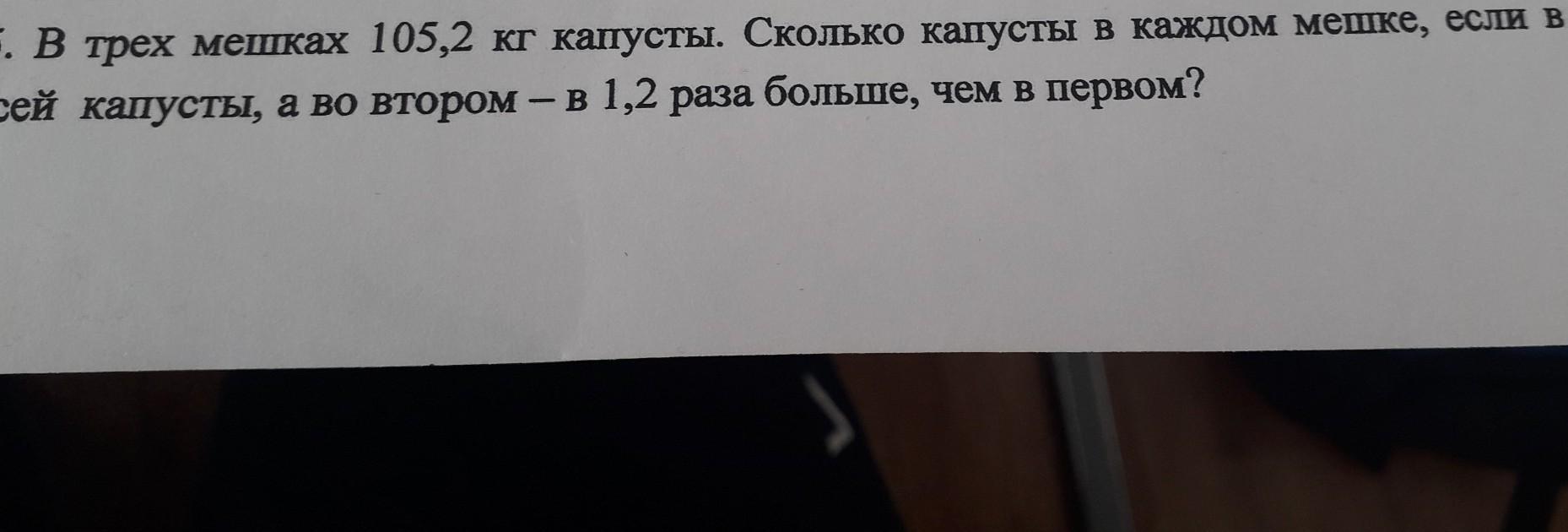 В трех мешках 105,2 капусты.Сколько капусты в каждом мешке если в первом 1/4 капусты а во втором -1,2 раза больше чем в первом