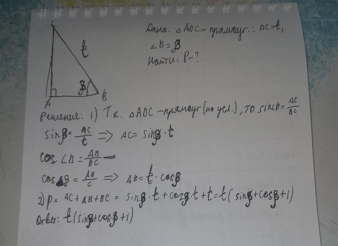 2. В прямоугольном треугольнике катет равен t, а острый угол -β . Выразите периметр треугольника через t и β