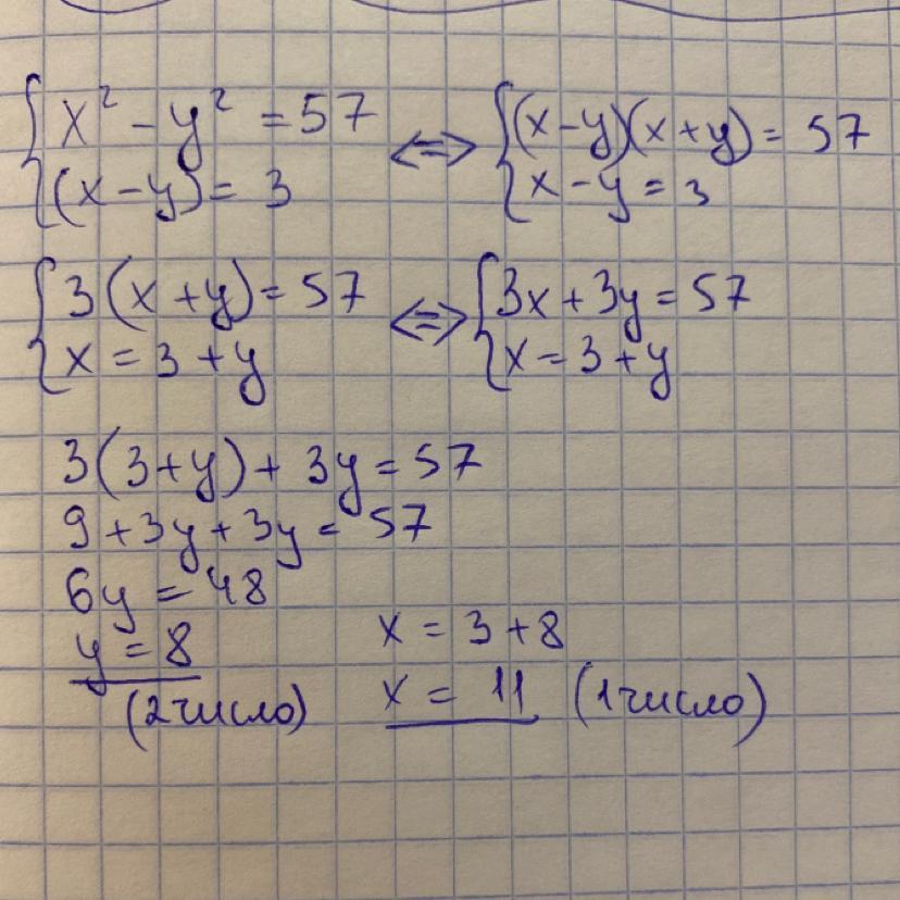 разность квадратов двух чисел равна 57 ,а разность этих чисел равна 3 .Найдите эти числа