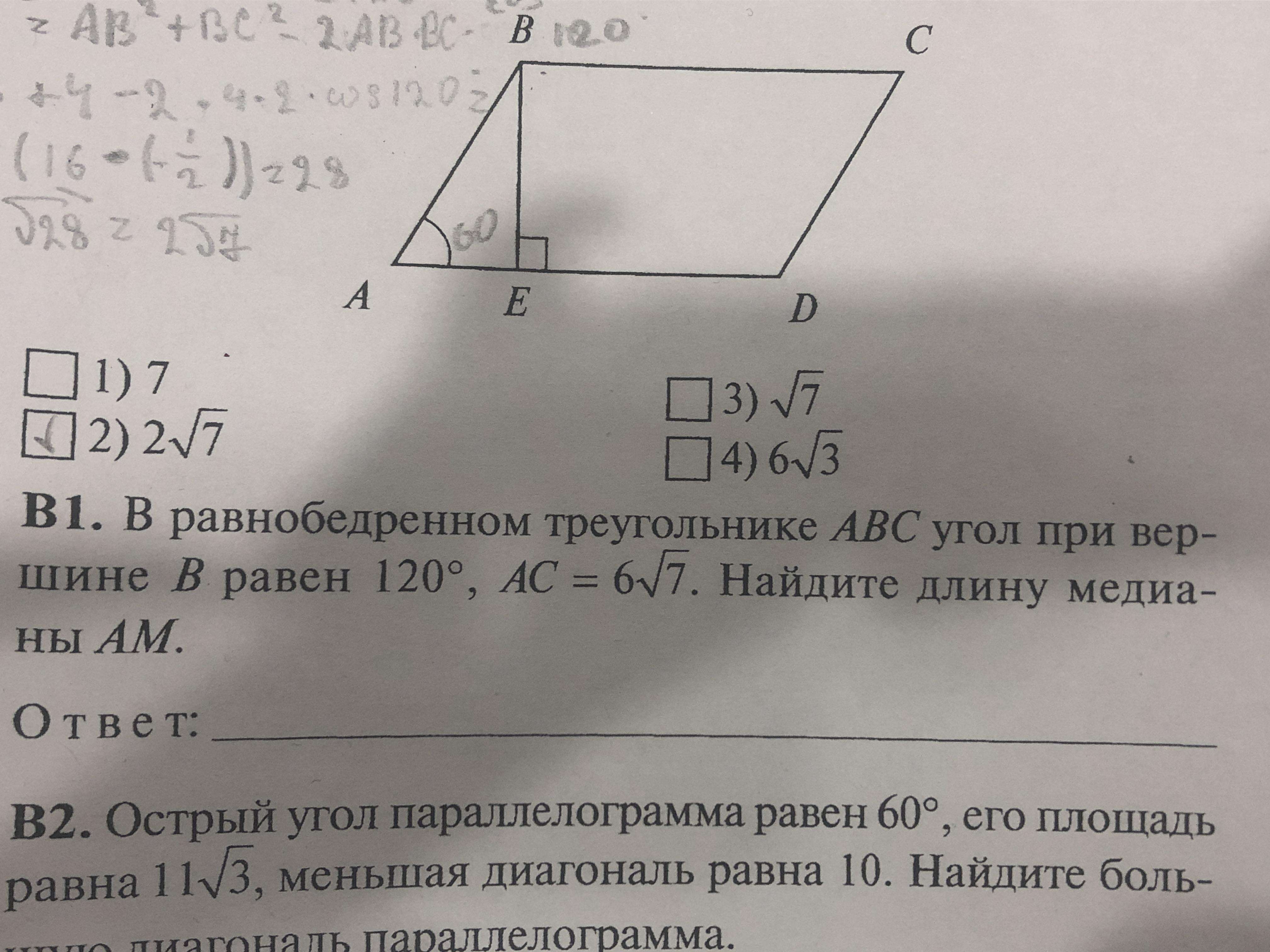 в равнобедренном треугольнике ABC угол при вершине В равен 120, AC= 6 корней из 7. Найдите Длину медианы АМ. ДАМ 100 БАЛЛОВ ПОЖАЛУЙСТА