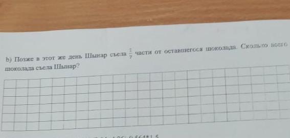 позже в этот же день Шынар съела 1\7 части от оставшего шоколада. Сколько всего кусочков шоколада съела Шынар?