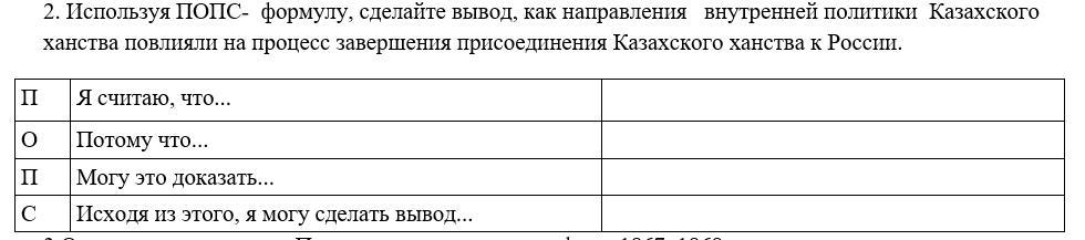 . Используя ПОПС- формулу, сделайте вывод, как направления внутренней политики Казахского ханства повлияли на процесс завершения присоединения Казахского ханства к России.