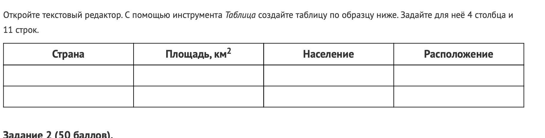 Откройте текстовый редактор. С помощью инструмента Таблица создайте таблицу по образцу ниже. Задайте для неё 4 столбца и 11 строк.