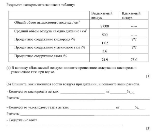 Ответ: Процент кислорода /% — 21 Процент диоксида углерода /% — 0,03 1 (b) Количество кислорода в легких больше / увеличивается при вдохе на 3,8 %. Расчеты: 21 – 17,2 = 3,8% Количество двуокиси углерода в легких при вдохе в 120 раз меньше, чем в выдыхаемом воздухе. Расчеты: 3,6/0,03 = 120