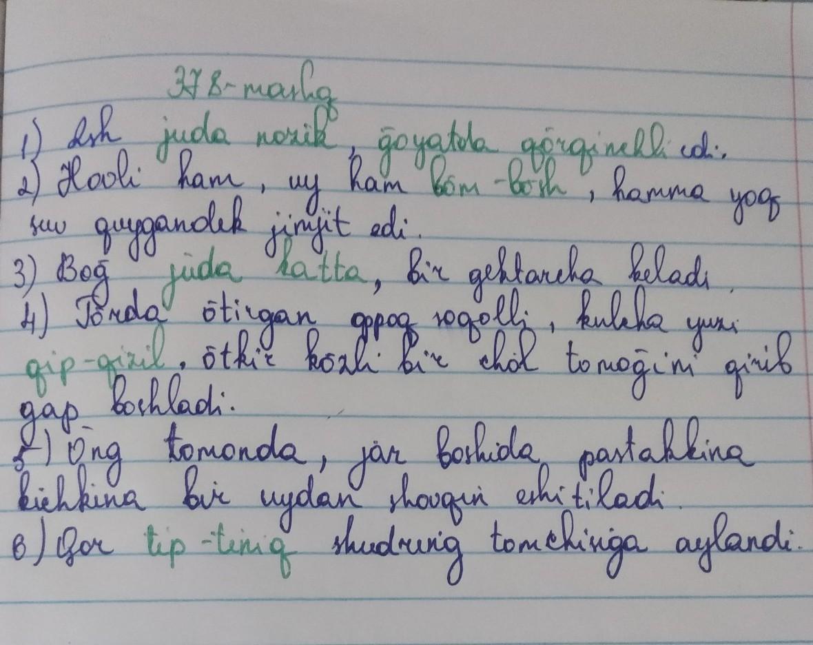 378-mashq. Uyga vazifa. Gaplarni ko'chiring. Orttirma darajadagi sifatlarning tagiga chizing. 1. Ish juda nozik, g'oyatda qo'rqinchli edi. (Abdulla Qodi- riy) 2. Hovli ham, uy ham bo'm-bo'sh, hamma yoq suv quygandek jimjit edi. (0. Yoqubov) 3. Bog' juda katta, bir gektarcha keladi. (X. To'xtaboyev) 4. Toʻrda o'tirgan oppoq soqolli, kulcha yuzi qip-qizil, o'tkir koʻzli bir chol tomogʻini qirib gap boshladi. (Mirkarim Osim) 5. O'ng tomonda, jar boshida pastakkina kichkina bir uydan shovqin eshitiladi. (Oybek) 6. Qor tip-tiniq shudring tomchisiga aylandi. (J. Razzoqov)