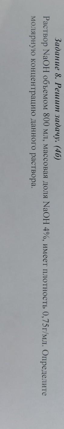 Задание 8. Решит задачу. (40) Раствор NaOH объемом 800 мл, массовая доля NaOH 4\% имеет плотность 0,75/ MJ1 . Определите молярную концентрацию данного раствора.