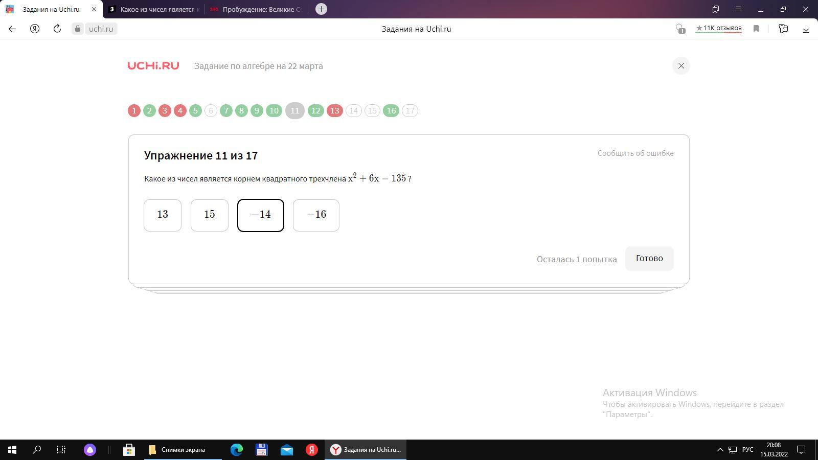 Из приведённых чисел (13; 15; -14; -16), ни одно не является корнем квадратного уравнения.