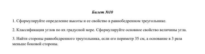 1. Высота треугольника — перпендикуляр, опущенный из вершины треугольника на противоположную сторону. Высота равнобедренного треугольника является его биссектрисой и медианой этого треугольника.