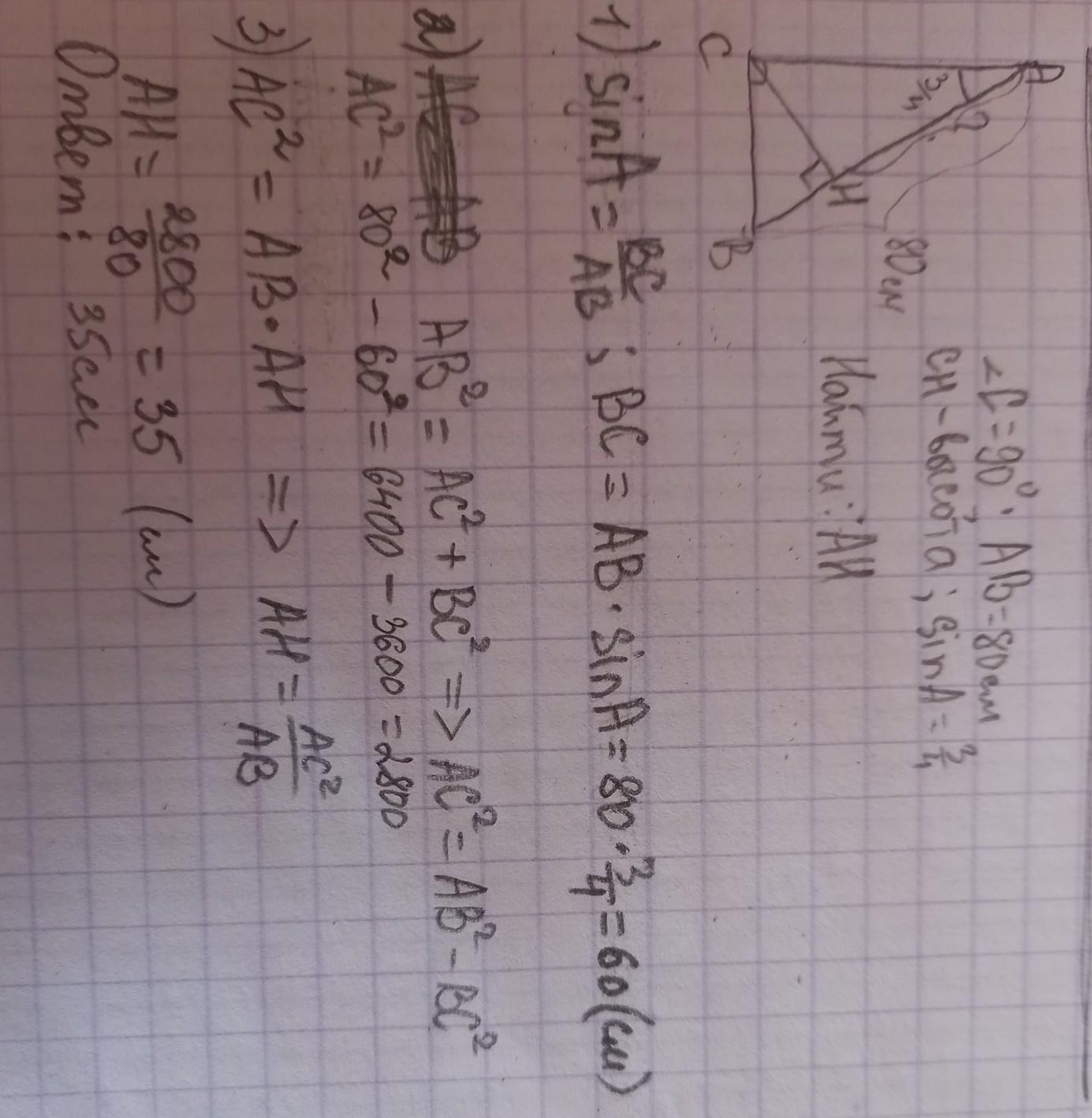 Треугольники ABC, угол C равен 90 градусов, CH высота, АВ равен 80 см. sin А 3/4 Найдите длину отрезка AH