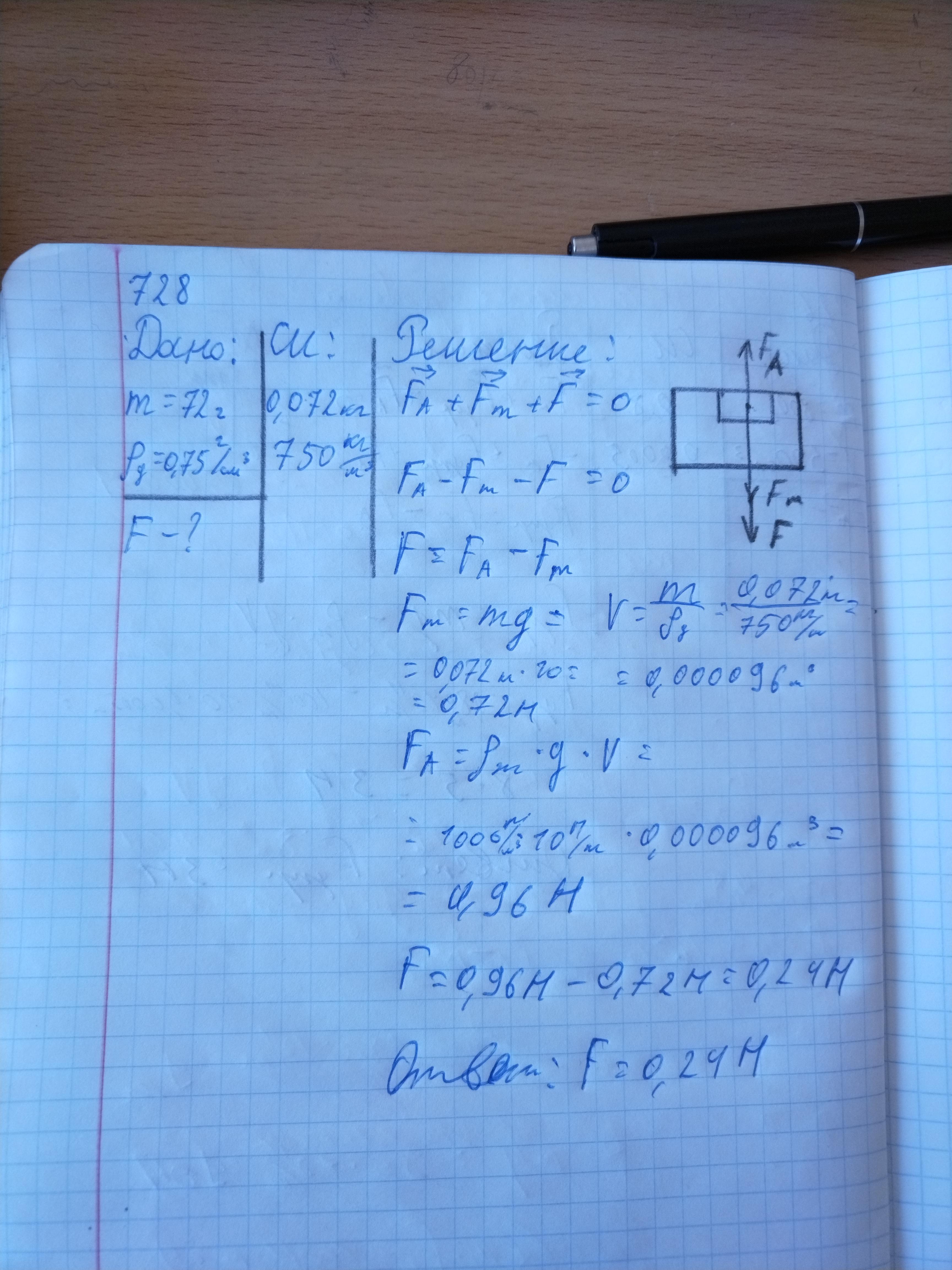 728. Определите модуль силы, которую необходимо приложить к куску дерева массой т = 72 г, чтобы удержать его под водой. Плот- ность древесины рд = 0,75 T см3 ответь Диме пжжжж даю 50 баловввввв