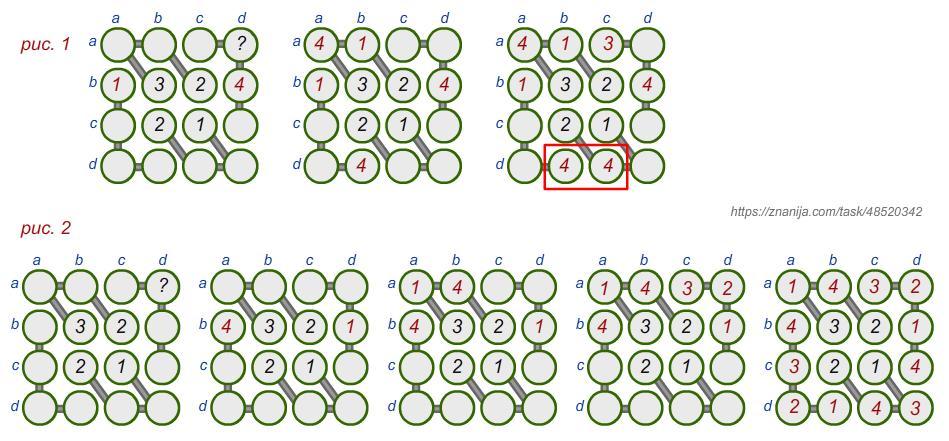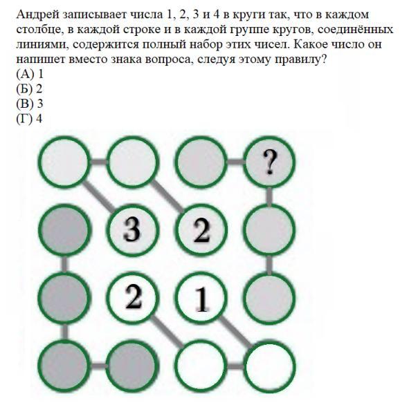 СРОЧНО!!! Андрей записывает числа 1, 2, 3 и 4 в круги так, что в каждом столбце, в каждой строке и в каждой группе кругов, соединённых линиями, содержится полный набор этих чисел. Какое число он напишет вместо знака вопроса, следуя этому правилу? (А) 1 (Б) 2 (В) 3 (Г) 4 (Д) Нельзя определить однозначно