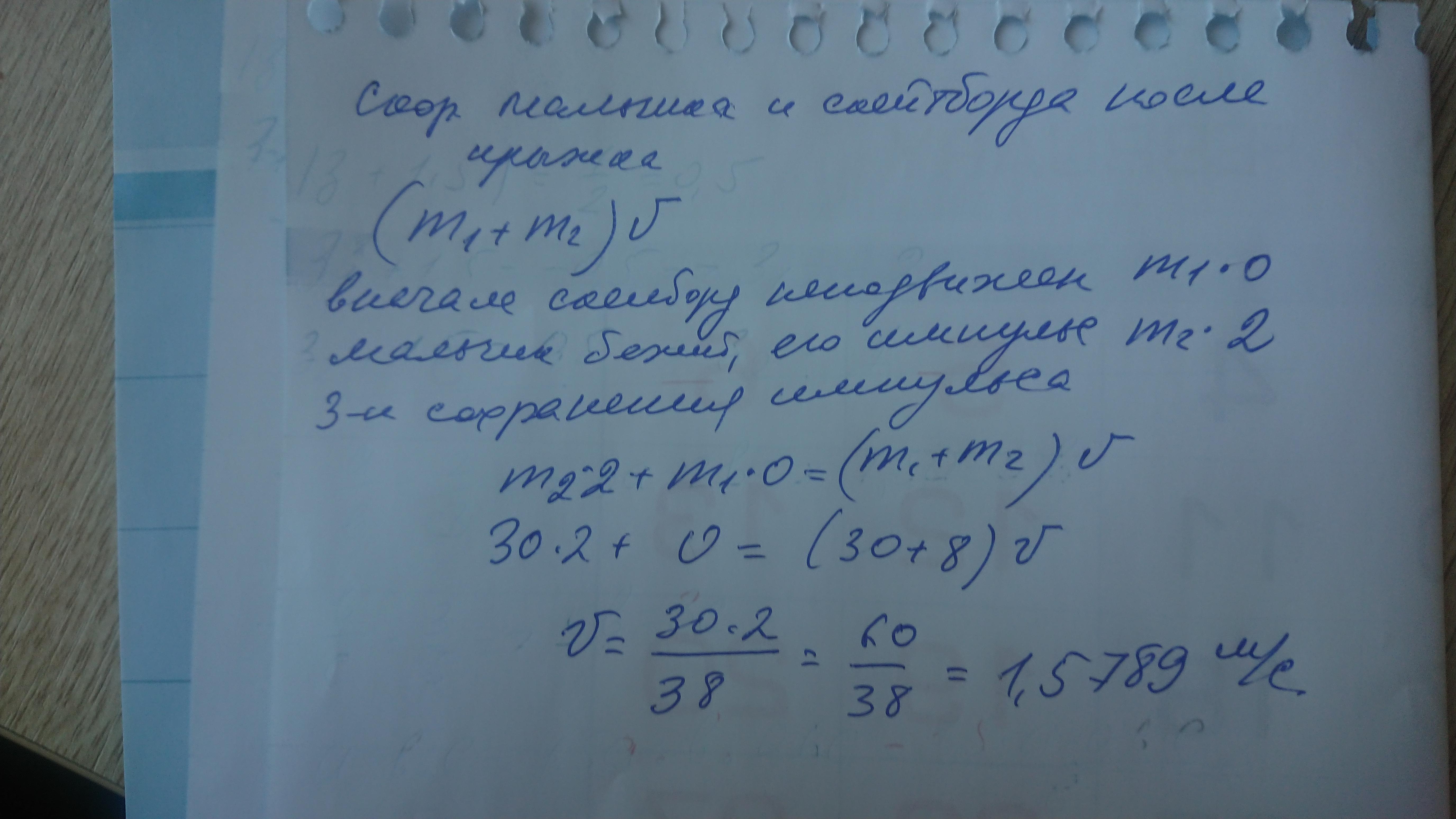 СРОЧНО!!! С какой скоростью начнёт двигаться скейтборд массой 8кг, находящийся в состоянии покоя, если на него запрыгивает мальчик массой 30 кг, бегущий со скоростью 2м/с