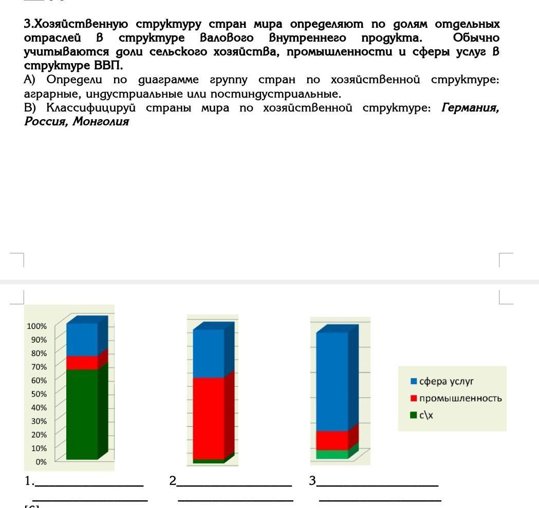 Хозяйственную структуру стран мира определяют по долям отдельных отраслей в структуре валового внутреннего продукта. Обычно учитываются доли сельского хозяйства, промышленности и сферы услуг в структуре ВВП. А) Определи по диаграмме группу стран по хозяйственной структуре: аграрные, индустриальные или постиндустриальные. В) Классифицируй страны мира по хозяйственной структуре: Германия, Россия, Монголия 1.________________ 2_________________ 3__________________ _________________ _________________ __________________ [6]