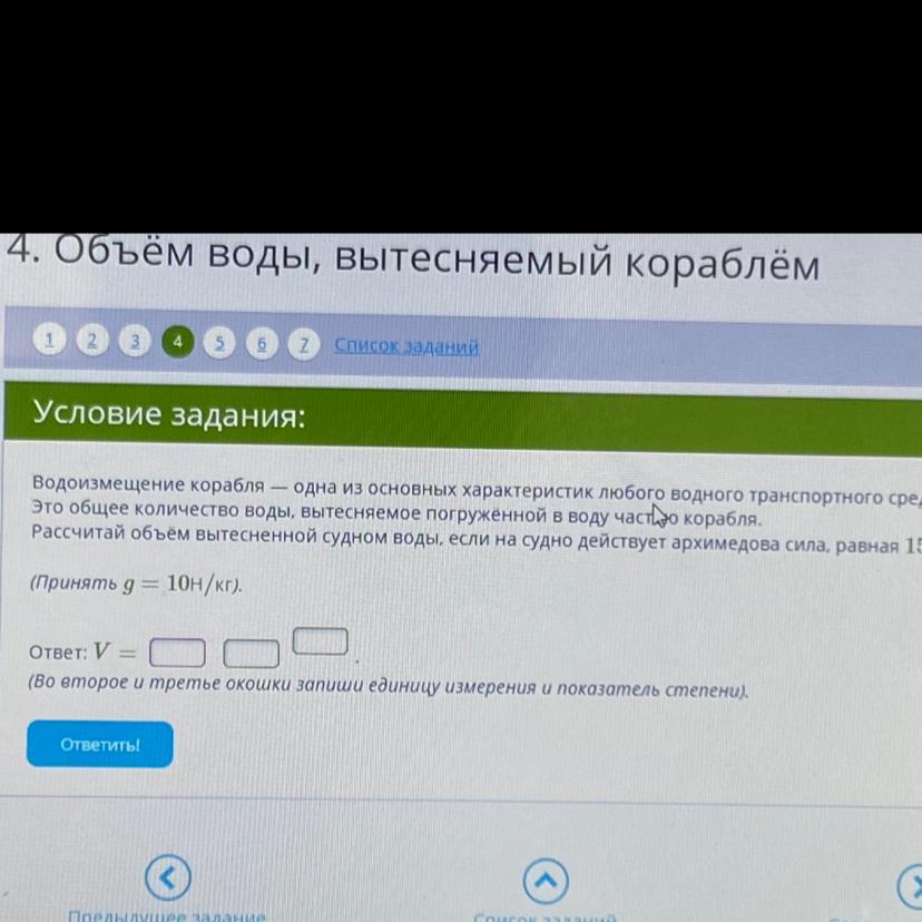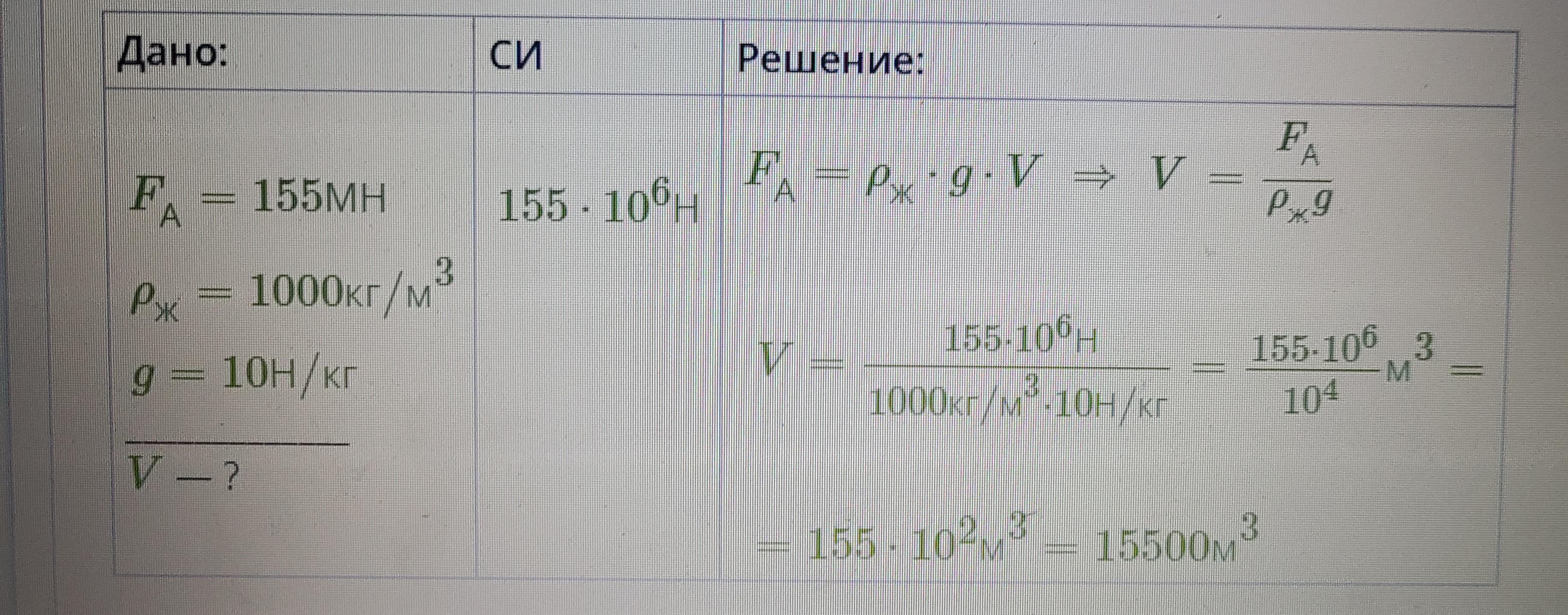 Рассчитай объём вытесненной судном воды, если на судно действует архимедова сила, равная 155 Мн.