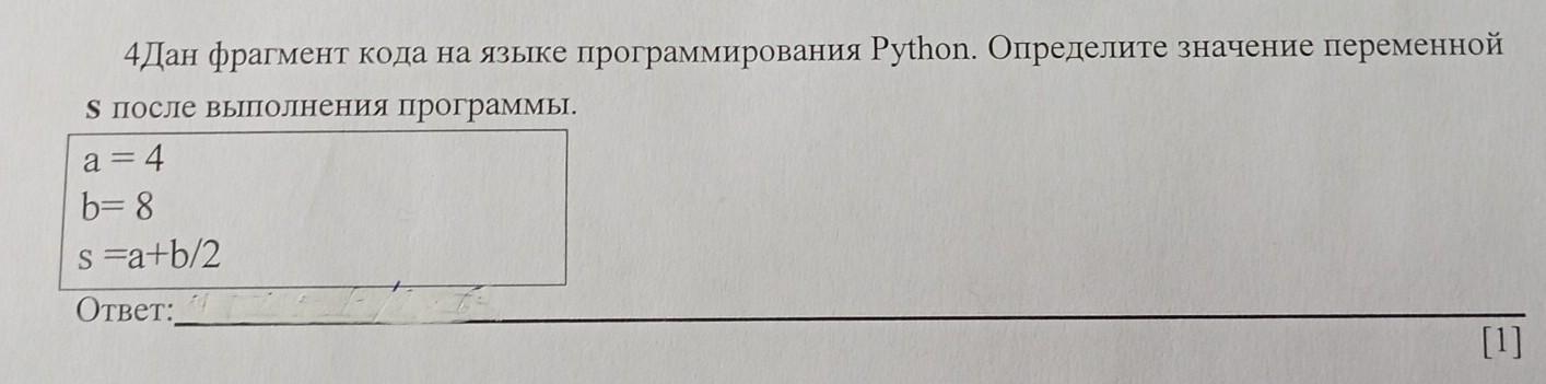 Так как в первую очередь выполняется деление, то s=4+4=8