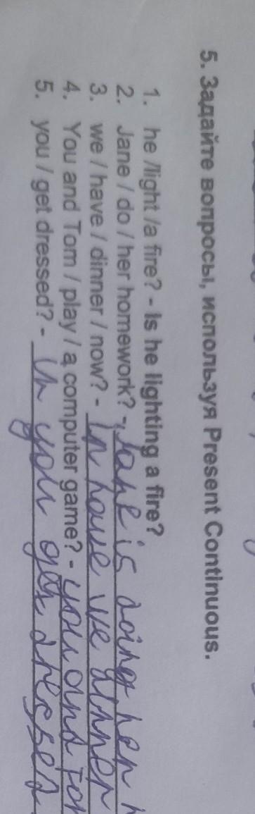 5. Задайте вопросы, используя Present Continuous. 1. he light la fire? - Is he lighting a fire? 2. Jane / do / her homework? - Jank is doing 3. we have / dinner / now?- in house we a 4. You and Tom/playl a computer game? - you 5. you / get dressed? - Uw you get da ?; an