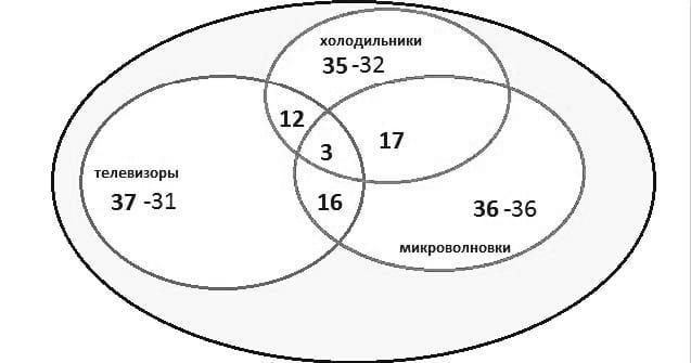 35-(12+3+17)=32 (холодильников куплено теми, кто купил больше одного товара)