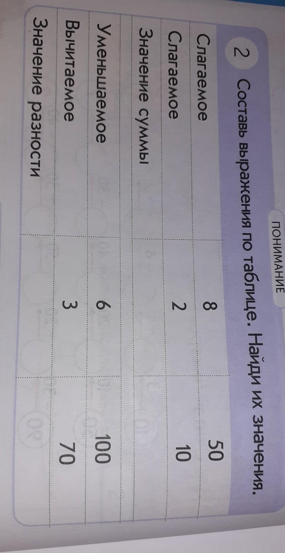 ПОНИМАНИЕ 2 Составь выражения по таблице. Найди их значения. 8 50 Слагаемое 2. 10 Слагаемое Значение суммы 6 100 Уменьшаемое 3 70 Вычитаемое Значение разности пж быстреее срочно
