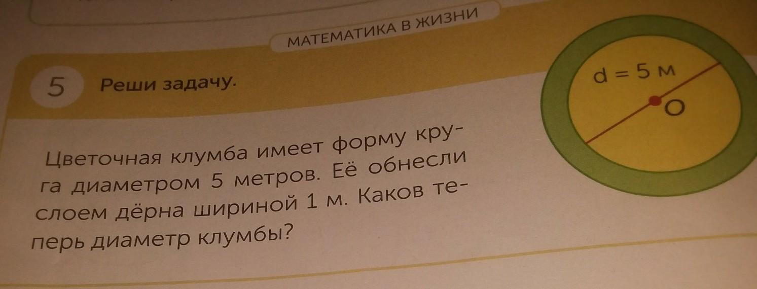 Цветочная клумба имеет форму кру га диаметром 5 метров. Её обнесли слоем дерна шириной 1 м. Каков те перь диаметр клумбы?