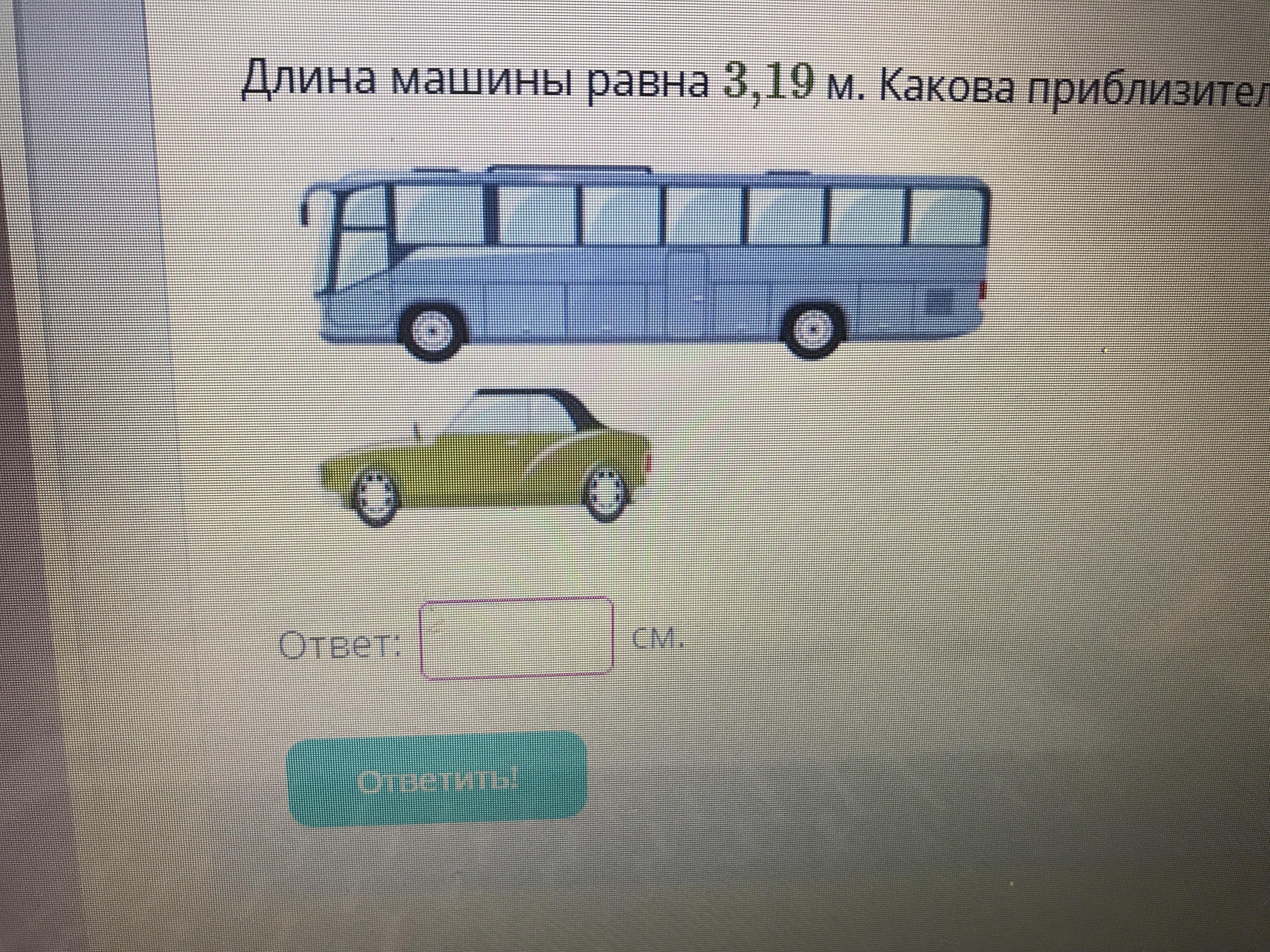 Длина машины равна 3,19 минут. Какова приблизительная длина автобуса ответ запиши в сантиметрах