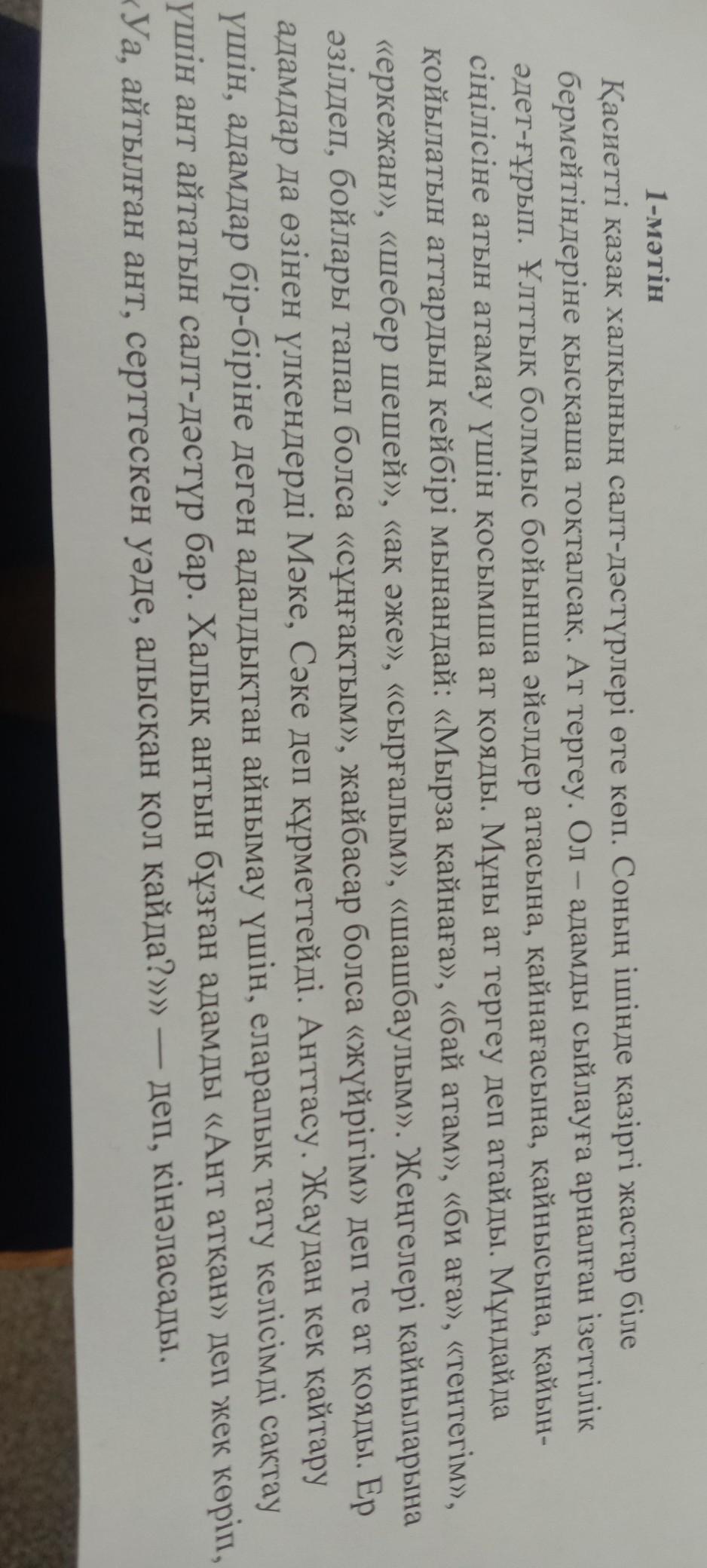 Көптеген қазақ халқы салт-дәстүрлері көп және оны кейбір жастар білмейді. Мысалы ат тергеу. Оны адамды сыйлауға арналған ізеттілік әдеп ғұрып дейді. Сіңлісіне,әйелдер атысына, қайынағасына тағы басқа тумаластарын атын атамау үшін қосымша ат қояды. Оны ат тергеу дейді. Мысалы:«Мырза қайнаға»,«бай атам»,«би аға» және тағы басқалары.