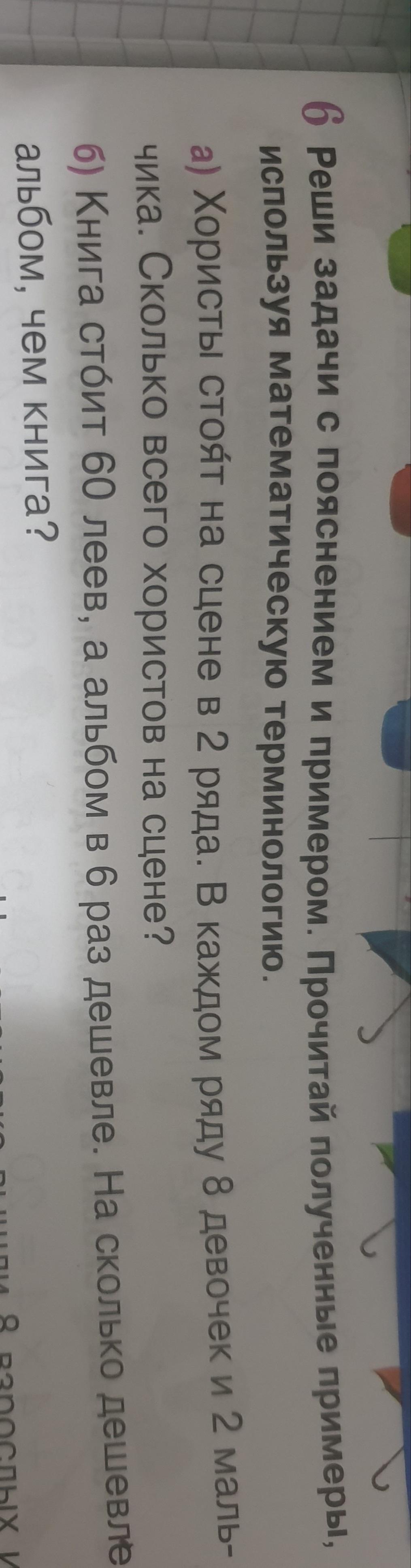 Пошаговое объяснение:(2+8)*2=20Мы имеем 2 ряда хористов,в каждом ряду 2 мальчика и 8 девочек, чтобы найти сколько хористов на сцене, надо сложить кол-во мальчиков и девочек в ряду(2+8) и умножить на кол-во рядов (то есть умножить на 2)