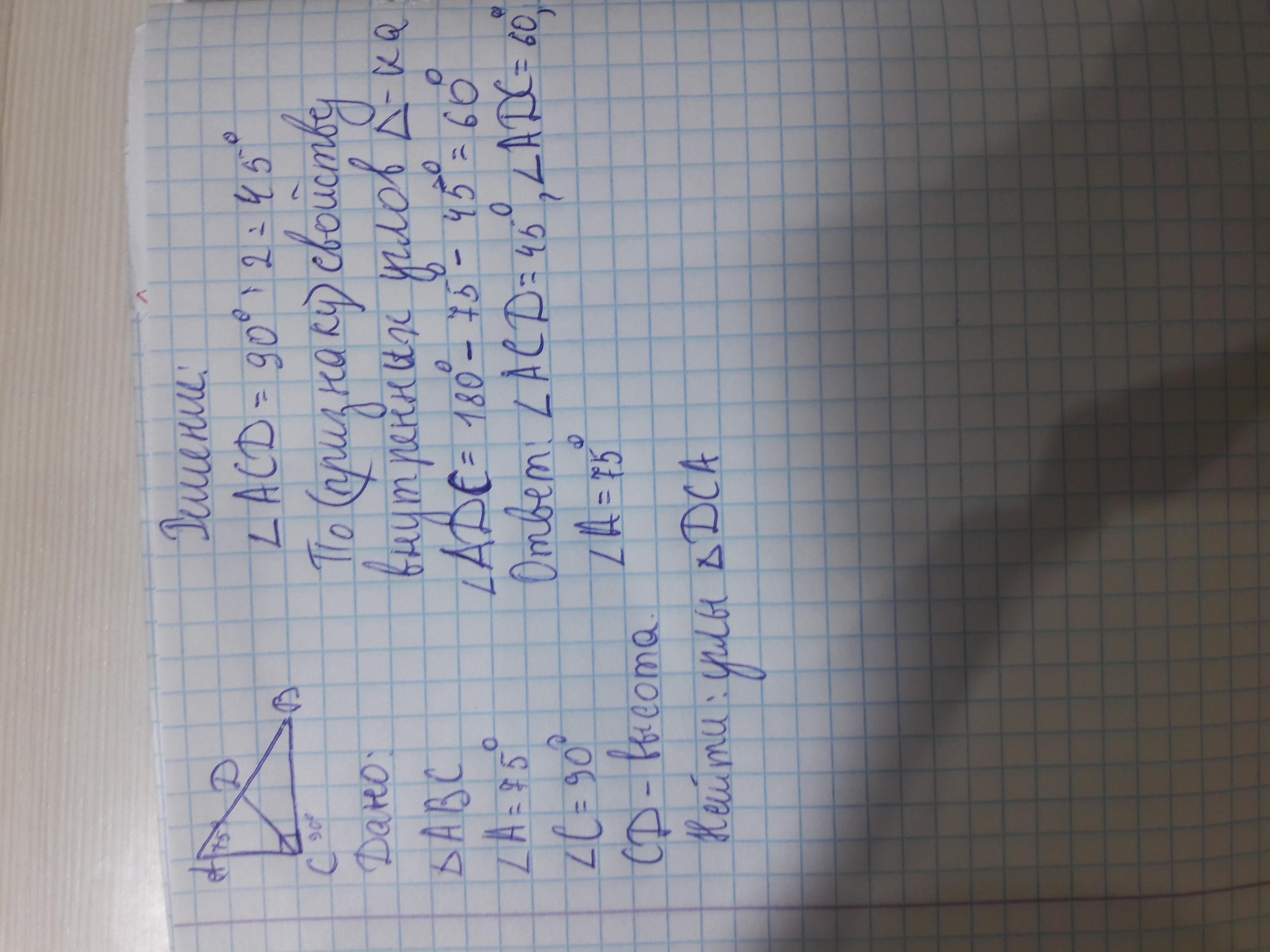 рассмотрим треугольник СДА. Угол А=75, угол Д=90, угол С = 180- угол А- угод Д= 180- 90 -75= 15