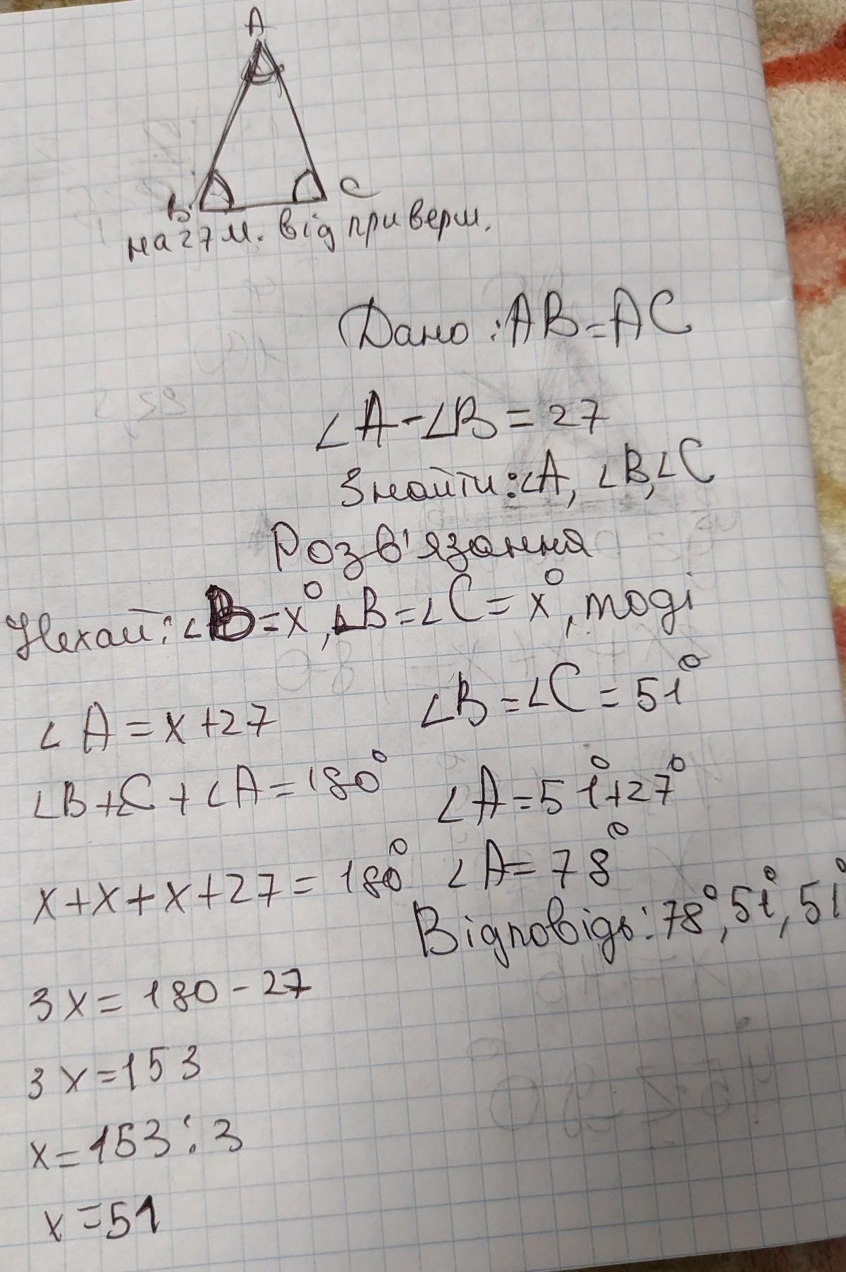 Знайдіть кути рівнобедреного трикутника, якщо кут при основі на 27 градусів менший від кута при вершині.