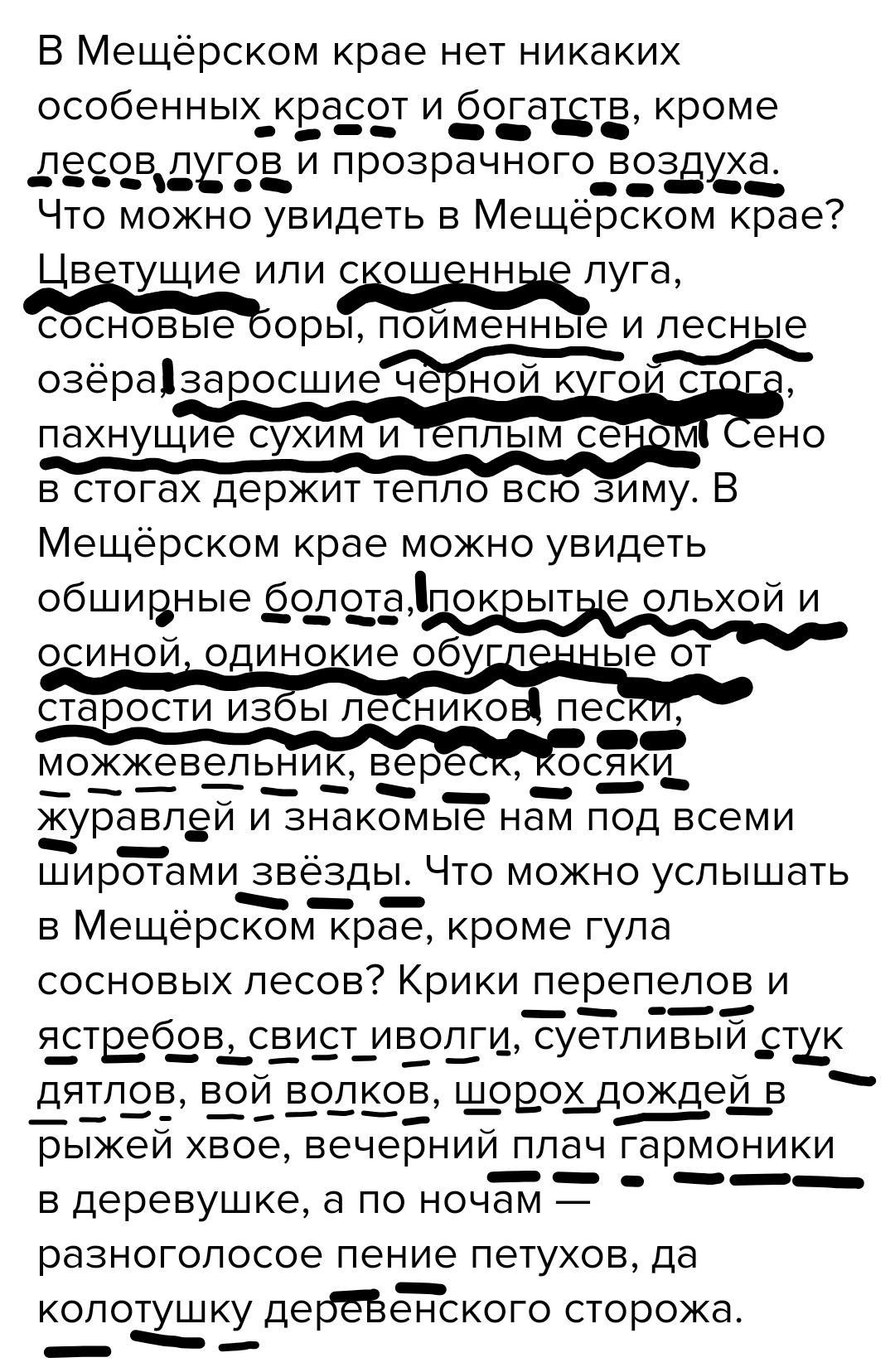 В Мещёрском крае нет никаких особенных красот и богатств, кроме лесов лугов и прозрачного воздуха. Что можно увидеть в Мещёрском крае? Цветущие или скошенные луга, сосновые боры, пойменные и лесные озёра, заросшие чёрной кугой стога, пахнущие сухим и тёплым сеном. Сено в стогах держит тепло всю зиму. В Мещёрском крае можно увидеть обширные болота, покрытые ольхой и осиной, одинокие обугленные от старости избы лесников, пески, можжевельник, вереск, косяки журавлей и знакомые нам под всеми широтами звёзды. Что можно услышать в Мещёрском крае, кроме гула сосновых лесов? Крики перепелов и ястребов, свист иволги, суетливый стук дятлов, вой волков, шорох дождей в рыжей хвое, вечерний плач гармоники в деревушке, а по ночам — разноголосое пение петухов, да колотушку деревенского сторожа.