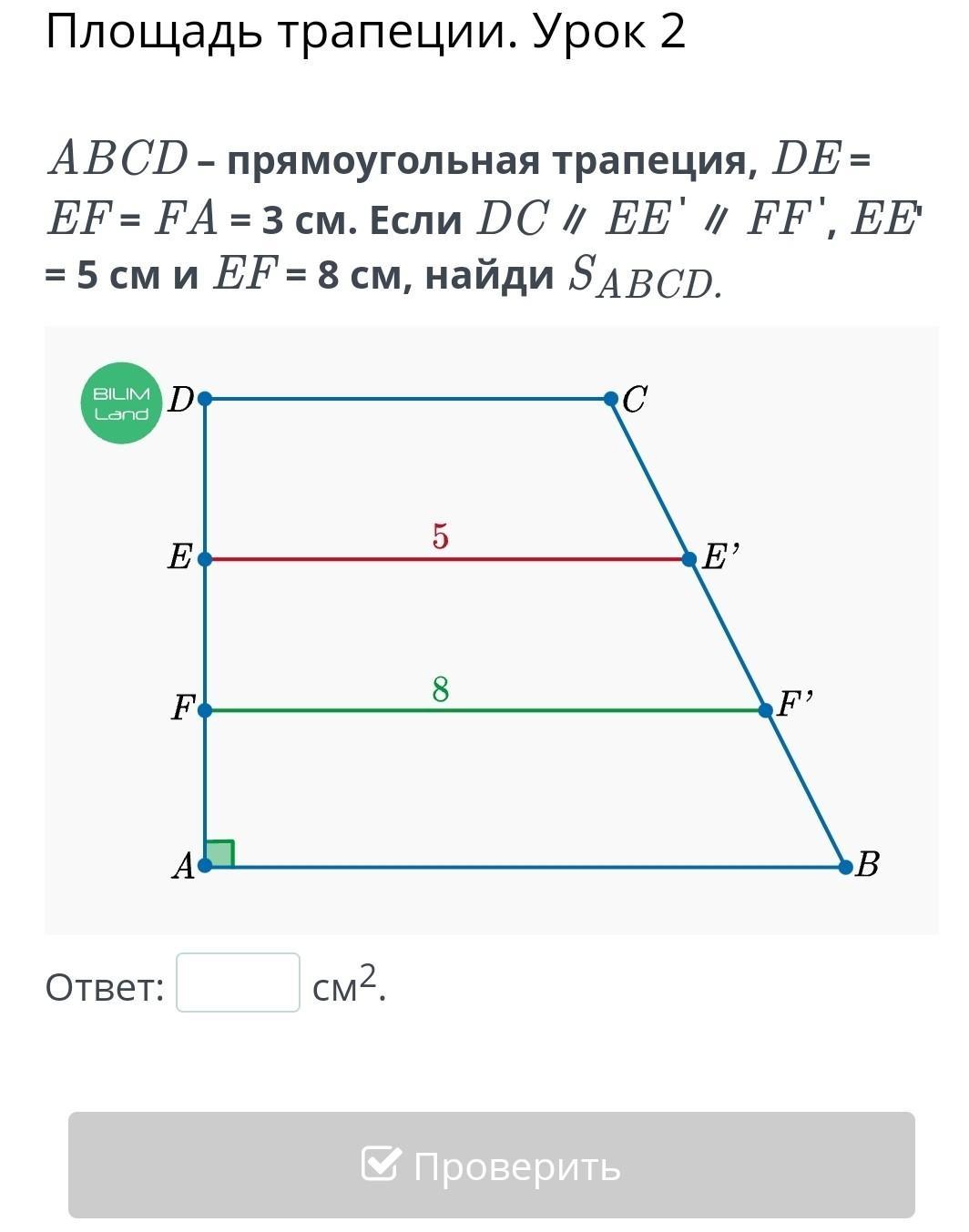 ABCD – прямоугольная трапеция, DE = EF = FA = 3 см. Если DC ∥ EE ' ∥ FF ', EE' = 5 см и EF = 8 см, найди SABCD.
