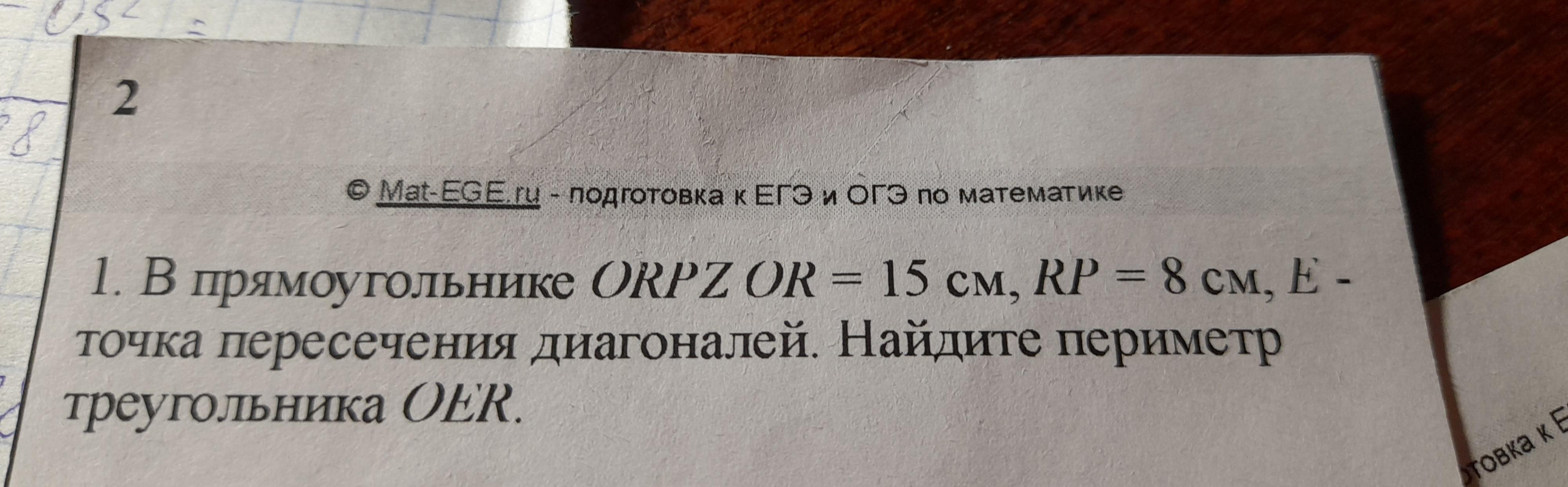Найдем любую из диагоналей по Пифагору, поскольку они равны, например ОР=√(ОR²+RР²)=√(15²+8²)=√(225+64)=√289=17/cм/, значит, две половинки диагоналей ОЕ и RE, тоже равны, по 17/2, а периметр треугольника OER равен 15+(17/2)*2=17+15=32/см/