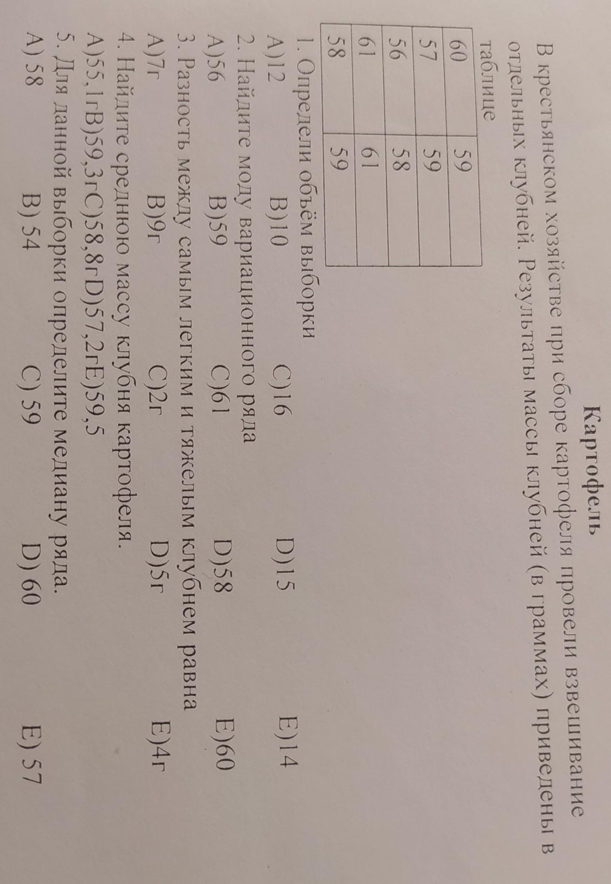 4. Найдите среднюю массу клубня картофеля. А)55, IrB)59,3 гC) 58,8rD)57,2гЕ)59,5