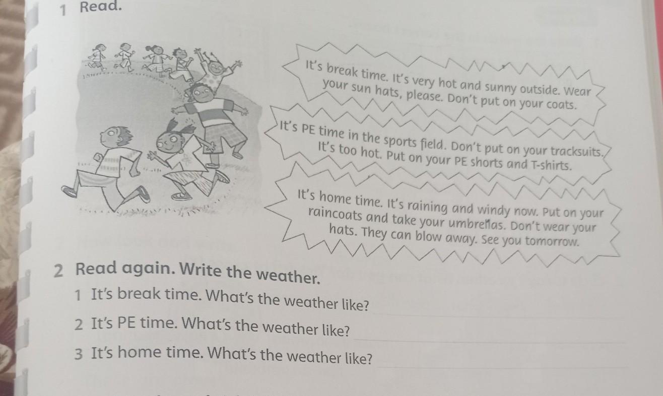 nha raincoats and take your umbrellas. Don't wear your hats. They can blow away. See you tomorrow. 2 Read again. Write the weather. 1 It's break time. What's the weather like? 2 It's PE time. What's the weather like? 3 It's home time. What's the weather like? 3 Read again and tick (). break time PE time home time!!!!!!
